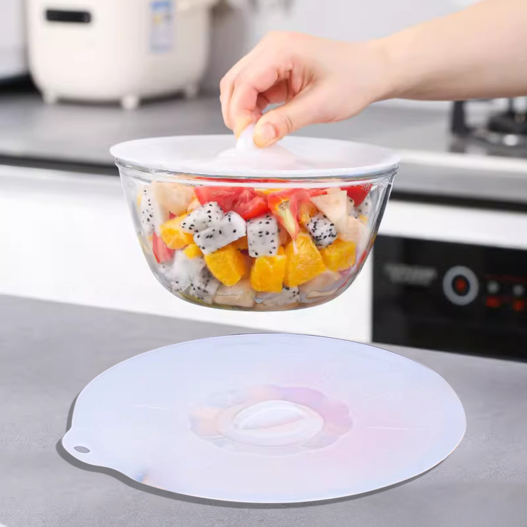 Reusable Silicone Stretch Lid: Flexible silicone cover stretches to fit various bowl sizes and shapes for secure food covering.