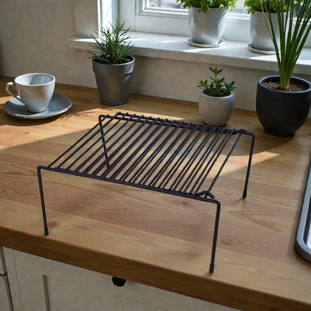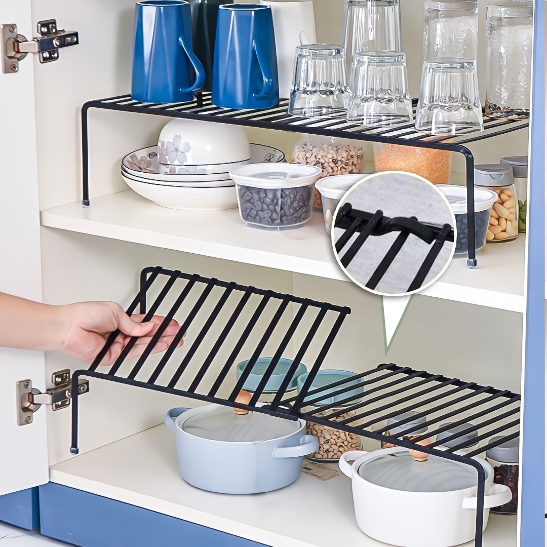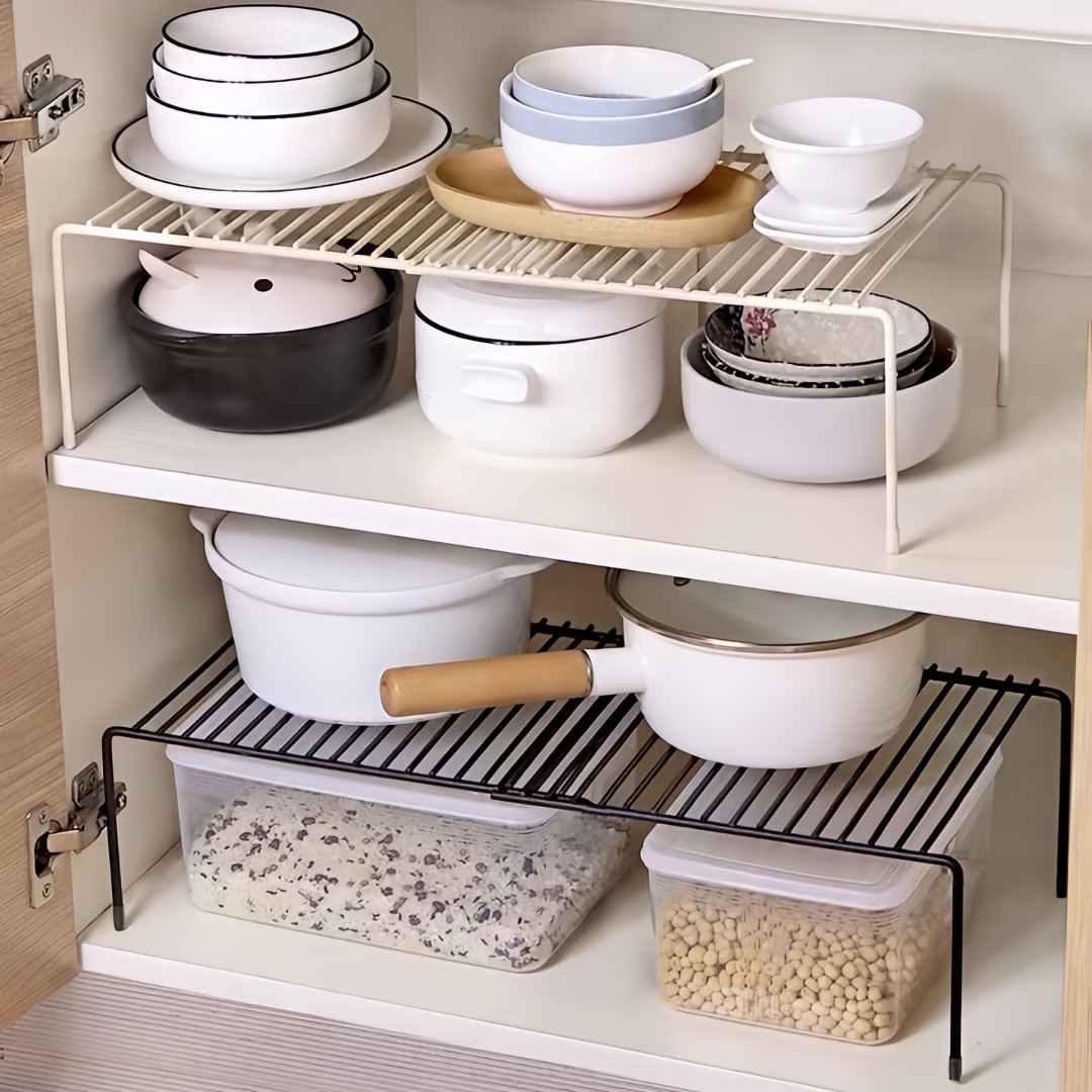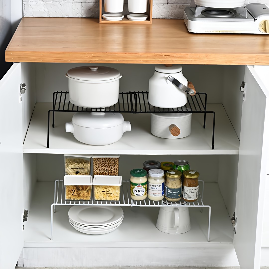 Space-Saving Vertical Storage: Creates an extra storage level to maximize vertical space, making it ideal for organizing jars, containers, spices, snacks, or kitchen essentials efficiently.