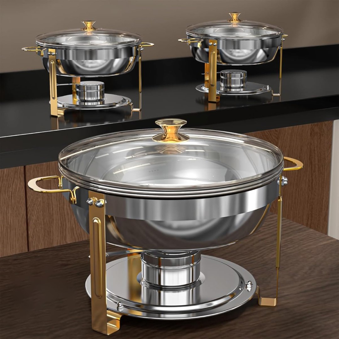 Elegant Buffet & Serving Design: Stylish round chafing dish with gold-tone accents adds a luxurious touch to buffets, catering events, hotels, and home gatherings.