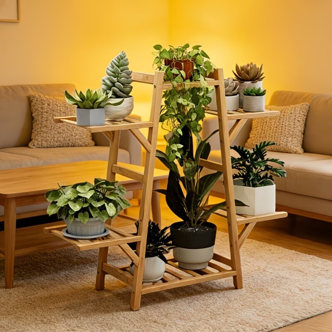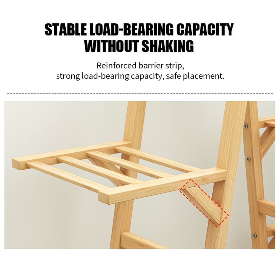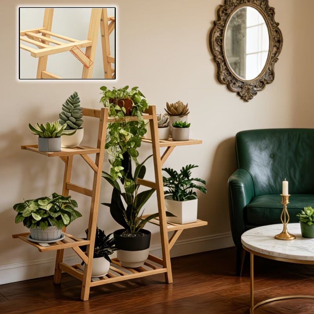 MULTI-TIER WOODEN PLANT STAND: Elegant ladder-style design with multiple shelves provides organized display space for plants, flowers, or decorative items.