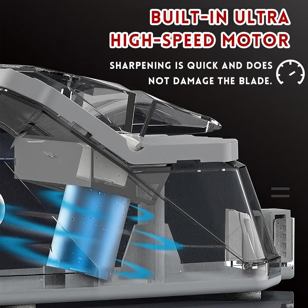 Powerful Motorized Sharpening System: Equipped with an electric grinding mechanism that sharpens blades evenly and efficiently with minimal effort.