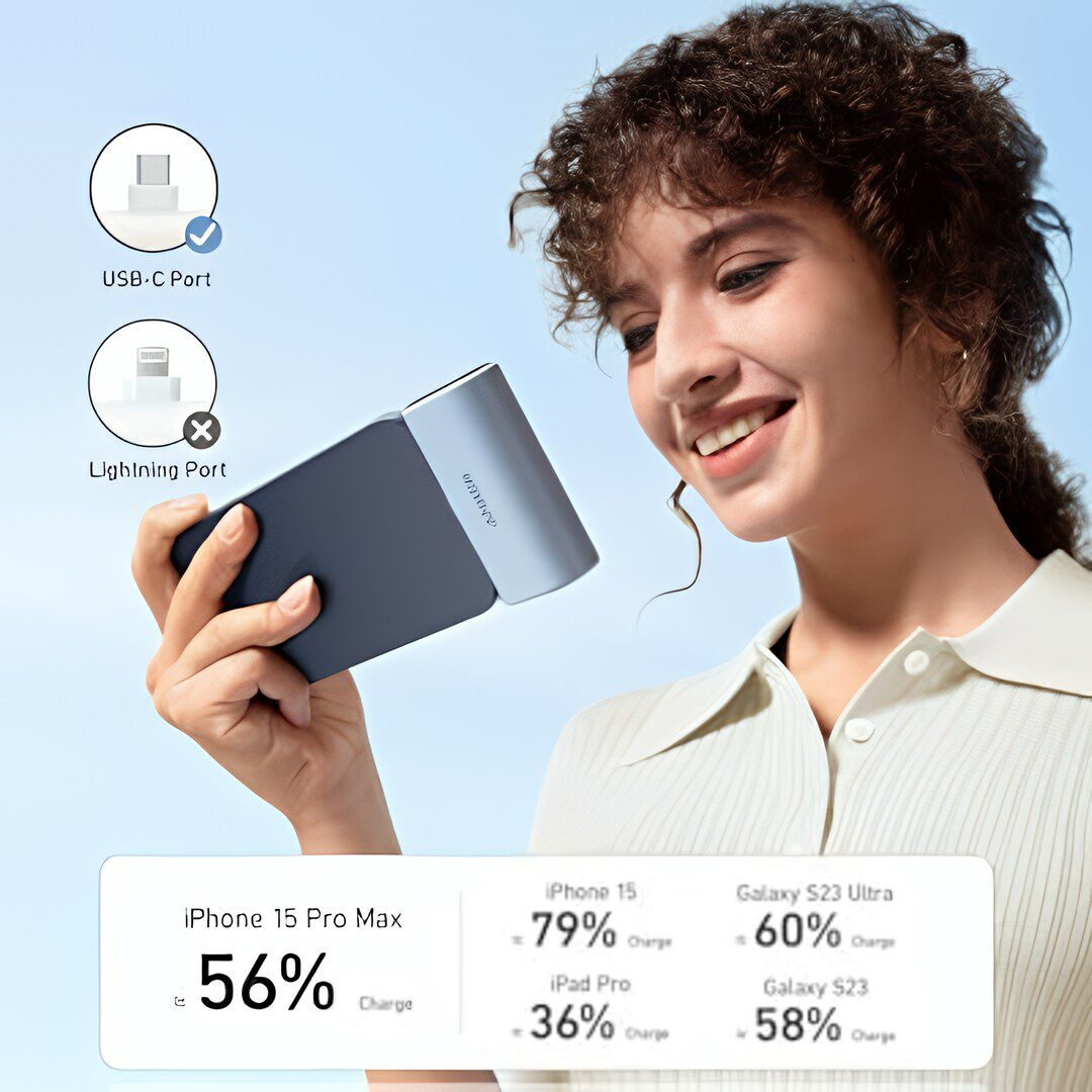 Dual Charging Options: Includes an additional USB-C input/output port, enabling flexible charging for both the power bank and other devices.