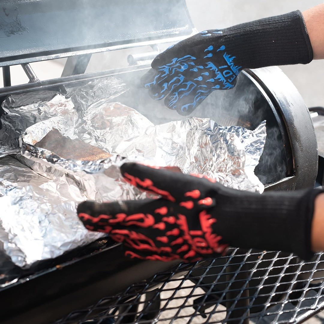 Excellent heat resistance. The oven gloves are made of BPA-free silicone and have a heat resistance range of -104℉ to 440℉. Environmentally friendly, safe and durable. Double-layer design: This barbecue glove is designed with external silicone gloves and internal heat-resistant cotton layer, which can comfortably absorb moisture and wick sweat, and maximize the protection of your barbecue and oven temperature. Long sleeves and cord design: This cooking glove is designed with long sleeves to protect your wrists and arms. The cuffs of the gloves are corded, so they can be hung on the hook even when not in use, which is convenient for storage and saves kitchen space. Anti-slip design: The surface texture of the waterproof glove provides anti-slip protection, so there is no need to worry about falling when picking up food or other things.